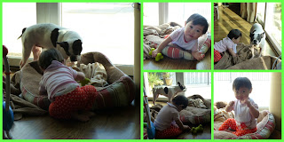 So, Miss Mia has been with us 2 months..and is just as happy as can be. She wakes up with a big ole smile, goes to bed smiling and is just constant grins all throughout her days. She has just fit into our little family so perfectly. The Boys absolutely adore her and she just loves to follow them around and destroy any toy or creation they are building. She loves the dog and can usually be found either chewing on her squeaky bone (enter gasp from ocd moms!), chasing her on all fours, or laying in Ciccia's bed, while the poor dog just sits there, thinking..."really?? she gets MY bed??".